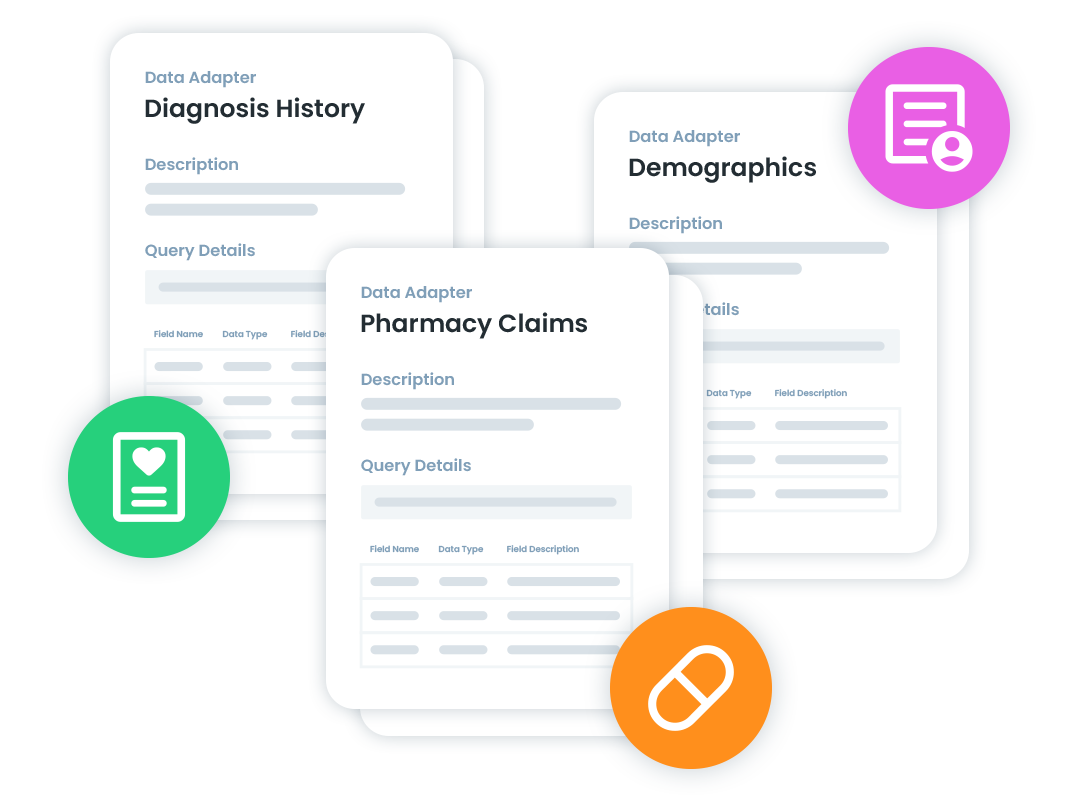 In-house AI / ML efforts often stop indefinitely when data transformation pipelines must be reengineered for production use. With ClosedLoop, your team can deliver value faster with data adapters that transform raw data into a standardized schema for use throughout training and production. Configurable templates for common data sources include: